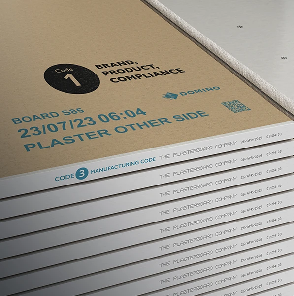 This is the most demanding printing application for plasterboard/drywall manufacturers. Printing at linear speeds of 100-200m/min. (300-600ft/min.) the code typically comprises a product description, compliance information/logos, such as manual handling warnings or European Waste Catalogue (EWC) codes, and perhaps manufacturing time/date stamp content. Critically, the manufacturer's logo, in a large format, is also printed as part of this message. The requirement for this content to reflect well on the manufacturer’s branding demands a combination of high print resolution and great print quality.