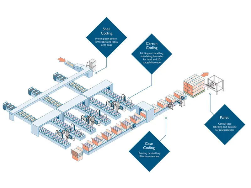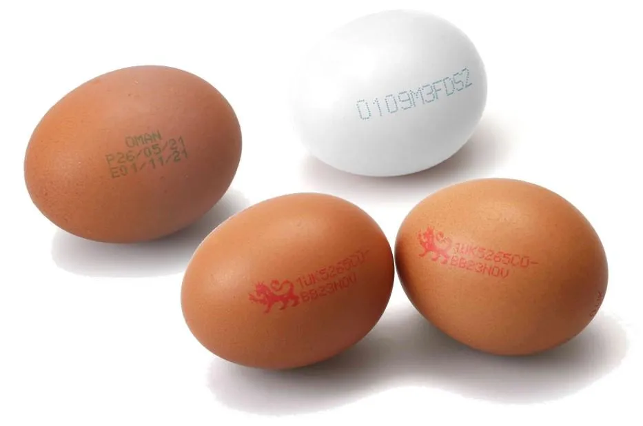 Avec des encres spécialement conçues pour le contact alimentaire direct et des imprimantes pouvant être intégrées à la plupart des calibreuses du marché, le jet d'encre continu (CIJ) est couramment utilisé pour le codage des coquilles d'œufs.
