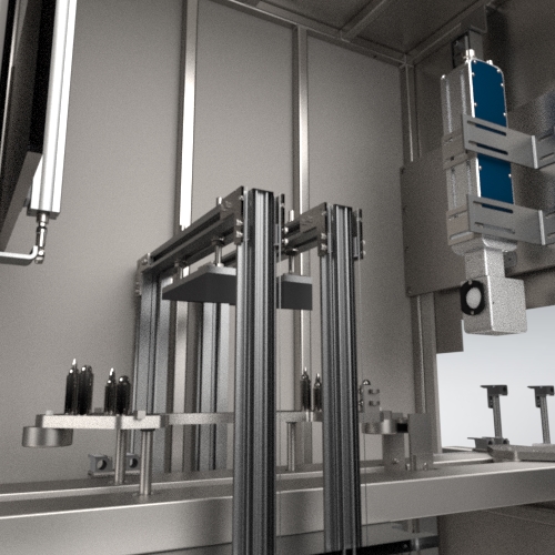 För att klara rätt laserklassning är konstruktionen byggd i 3 mm rostfritt stål. Tack vare det har kundens operatörer en säker arbetsmiljö. Kabinettet är inbyggd i produktionslinjen, med hjälp av en palettbana kan komponenterna transporteras genom märkstationen. Skåpet är utrustat med luckor som automatiskt öppnas och stängs efter varje komponents avslutade märkprocess. Varje komponent hissas upp till skrivaren med hjälp av en hydraulik-konstruktion för att inte vibrationer från produktionslinjen ska störa märkningen.