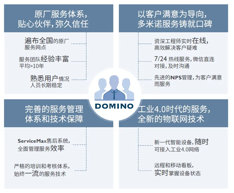 多米诺工程师接受广泛的培训计划,其中涵盖喷码机技术、应用程序与客户生产要求,可为客户提供专业和高效的服务。